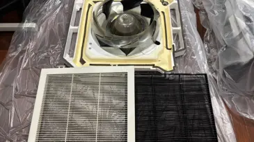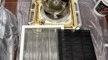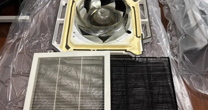 エアコンの周囲をビニールで保護しながら分解。フィルター、アルミフィン、ファンなどの主要部品を取り外します。